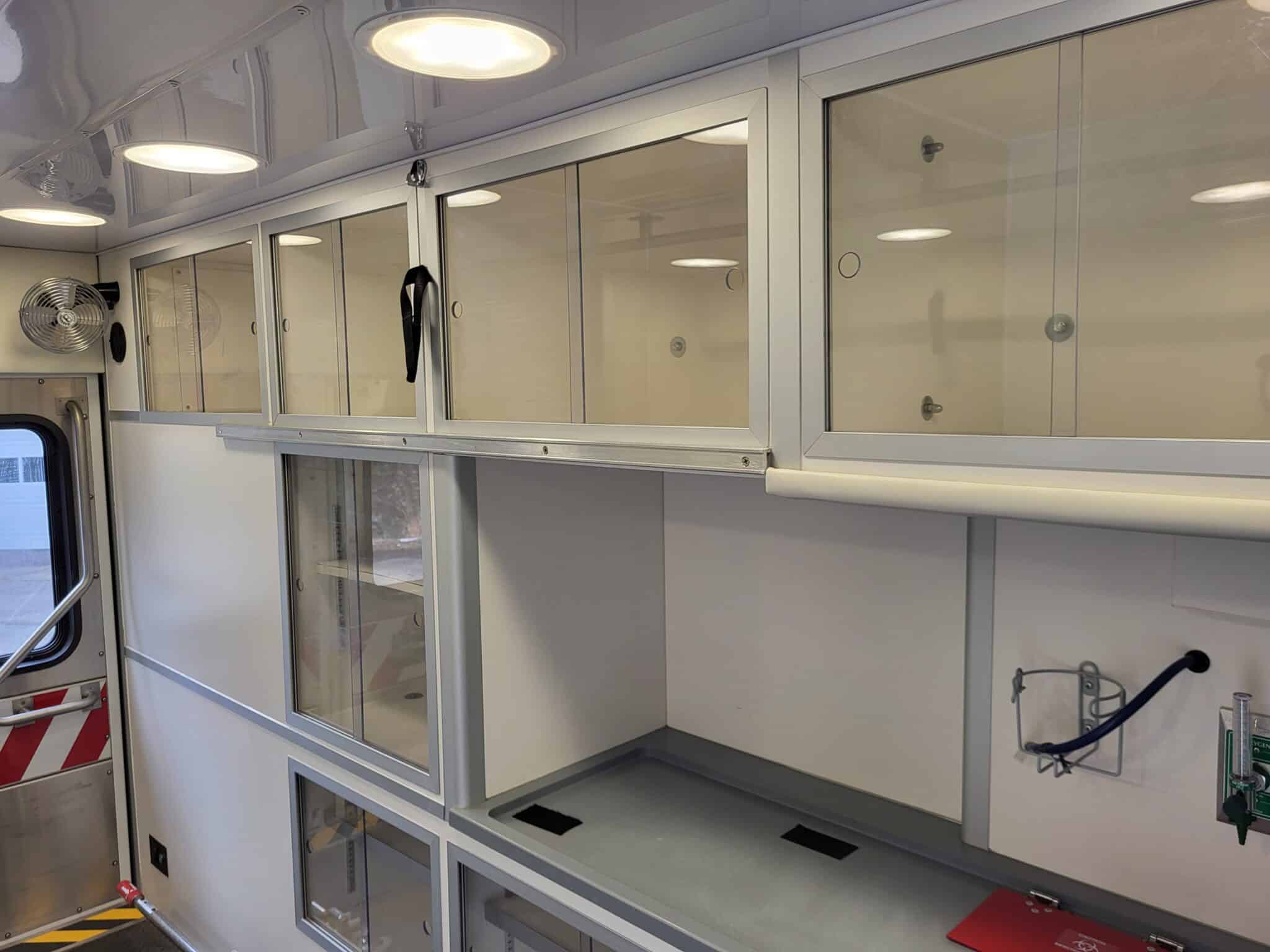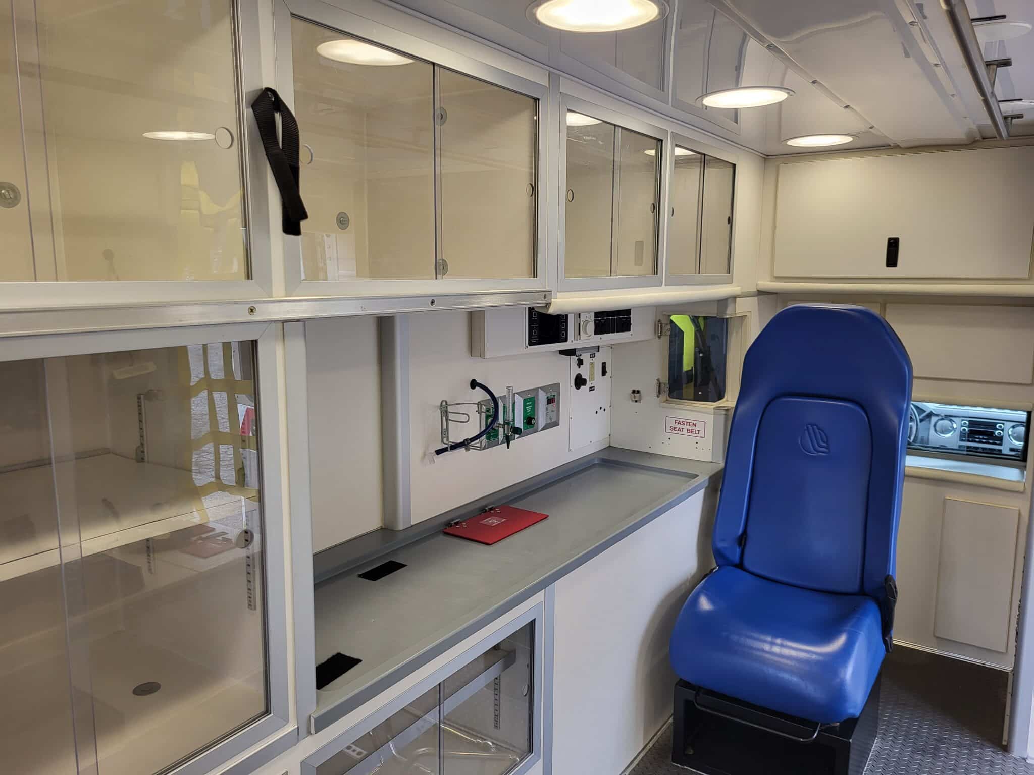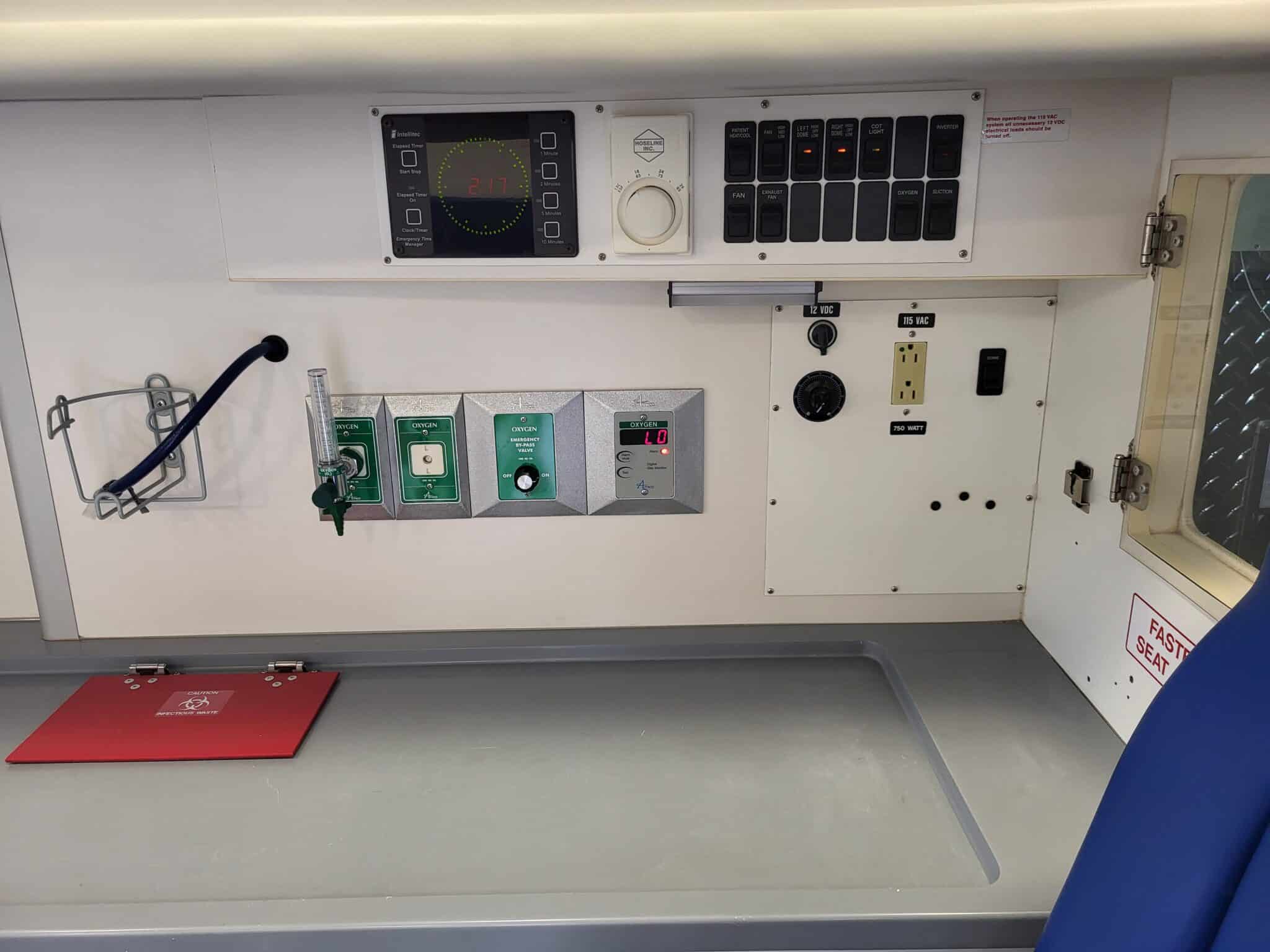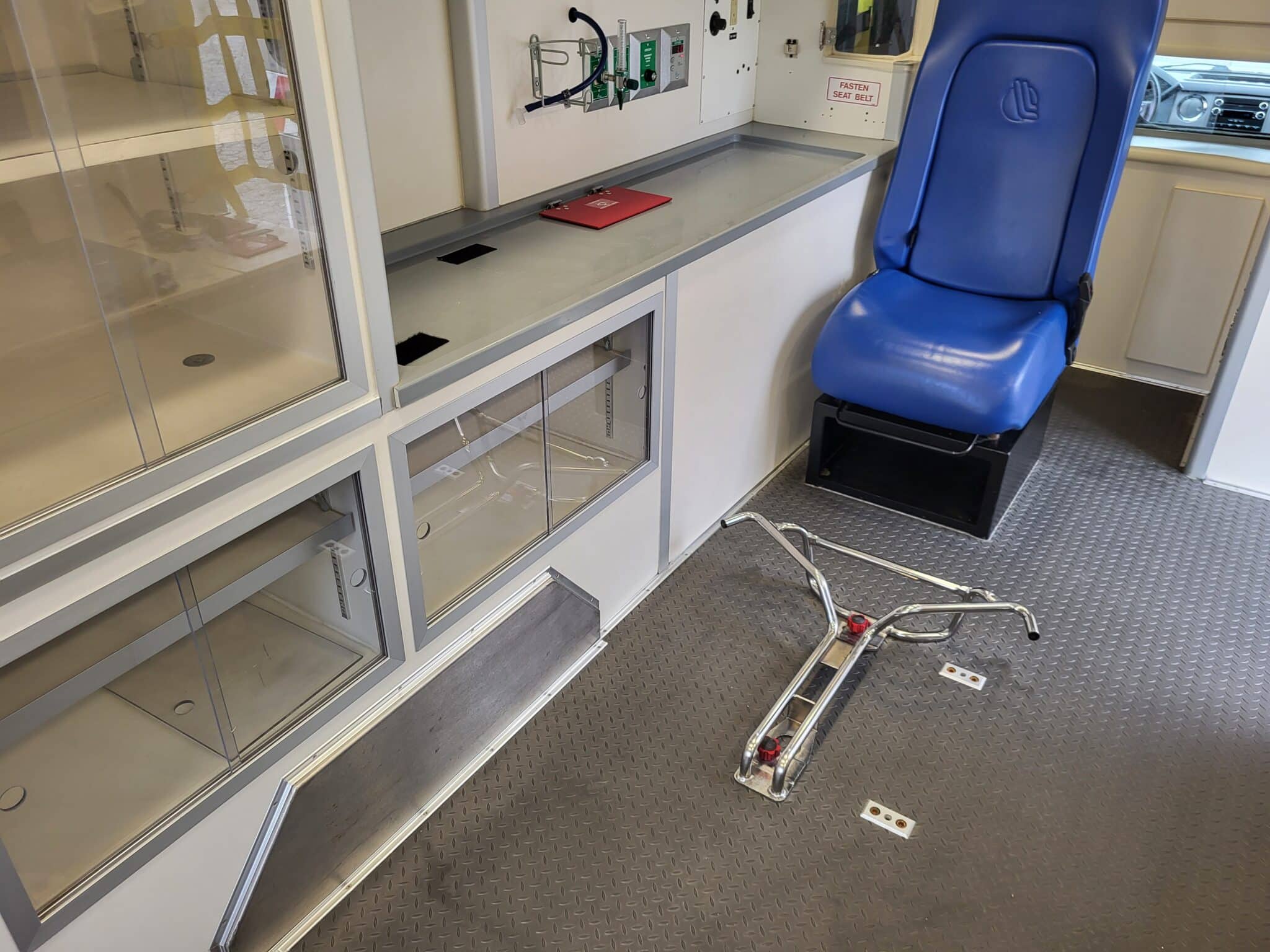 Special features: o2 lift, solid countertops, cooling cabinet, curbside O2 access, air ride with rear door drop controls, carbon monoxide sensor, kussmaul auto eject, kwiki step, Stryker antler and lock bar retention system.